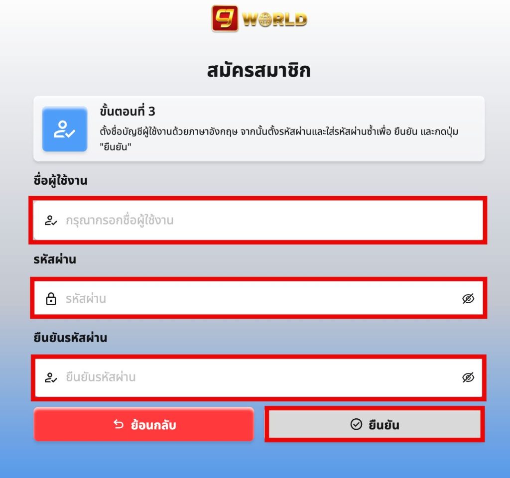 หลังจากนั้นกรอกข้อมูล ชื่อผู้ใช้งาน ( username ) ตั้งรหัสผ่าน ยืนยันรหัสผ่าน แล้วกด ยืนยันข้อมูล