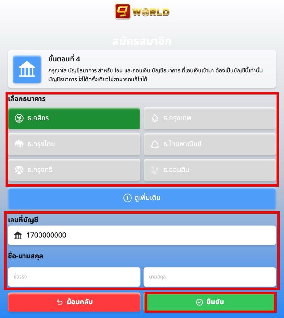 ขั้นตอนสุดท้ายเลือกบัญชีธนาคาร สำหรับการโอน และ ถอนเงิน กรอกข้อมูลให้ครบถ้วน แล้วกดยืนยันข้อมูล